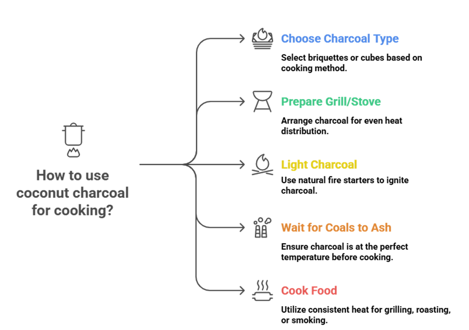 Using coconut charcoal for cooking is simple if you follow the right steps. Here’s a step-by-step guide: